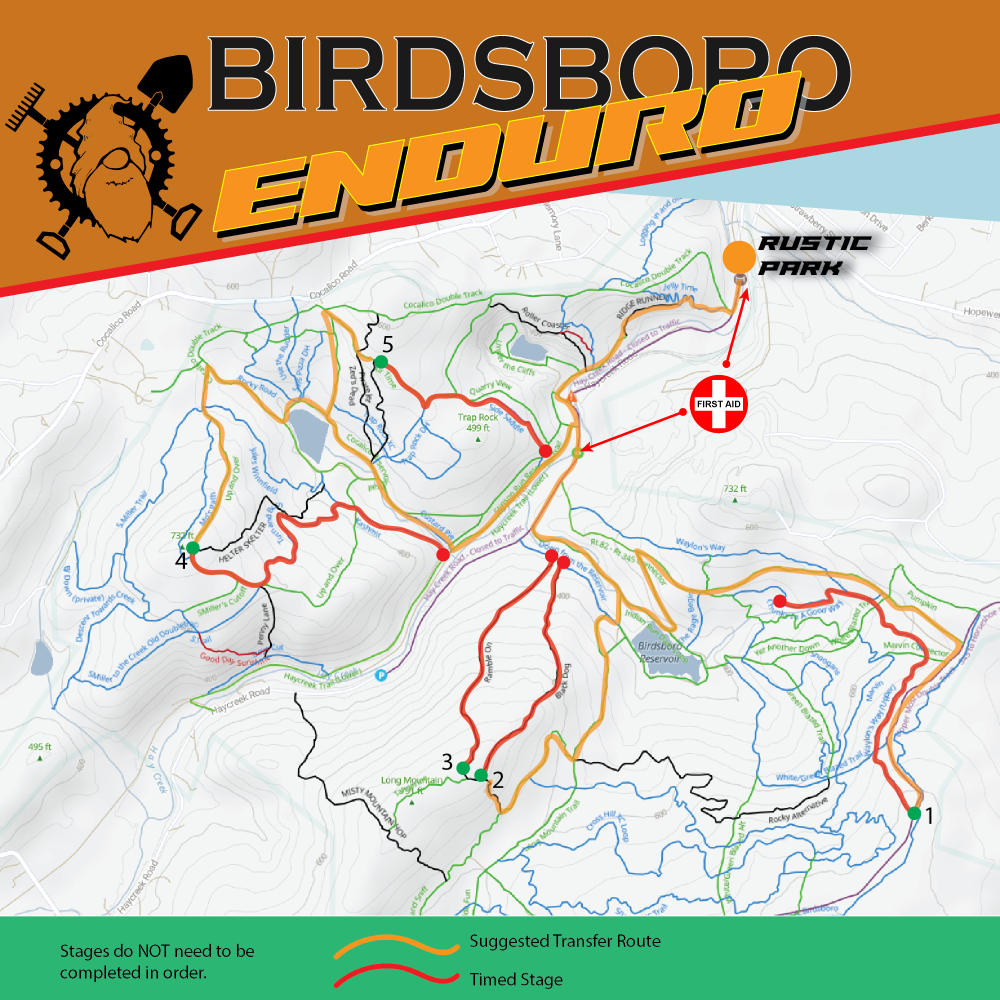 Welcome to the 2025 Birdsboro Enduro! The course will consist of 5 downhill, timed stages. The approximate distance is 14 miles with about 2500 feet of climbing. Home base will be setup at Rustic Park where you will register for your RFID tag. We are aiming to have riders on course by 9:00 AM, so be there earlier to get setup and registered. The stages range from rocky and rooty to more rocky and more rooty. There are a couple sections that demand some hammering on the pedals, so be prepared! Since this is an unsanctioned event, the goal is to have fun. Help your fellow riders and enjoy the experience the trails in Birdsboro offer. This is a rain or shine event, but hopefully a sunny day this time around!